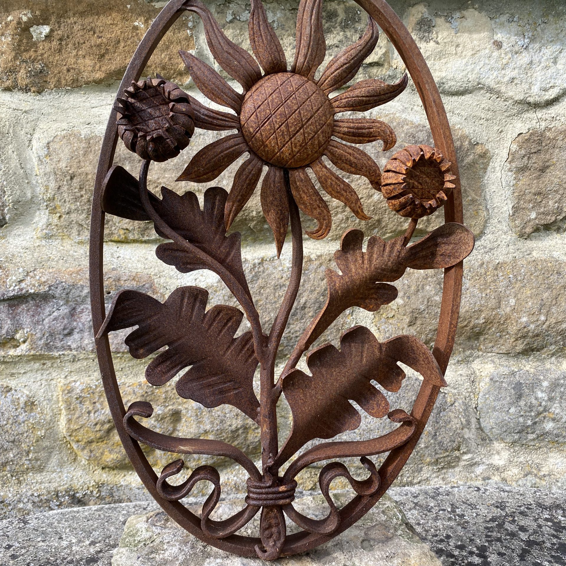 Unusual garden decor in the form of a decorative iron work rosette set into a stone block for stability. Something maybe for that awkward area of your garden to create a bit of interest.