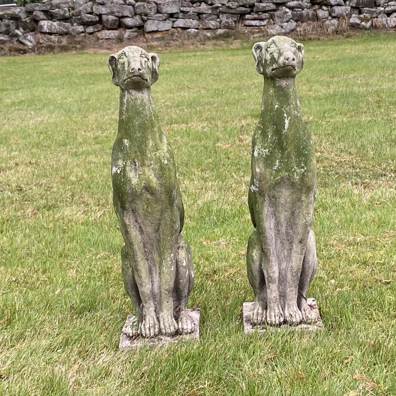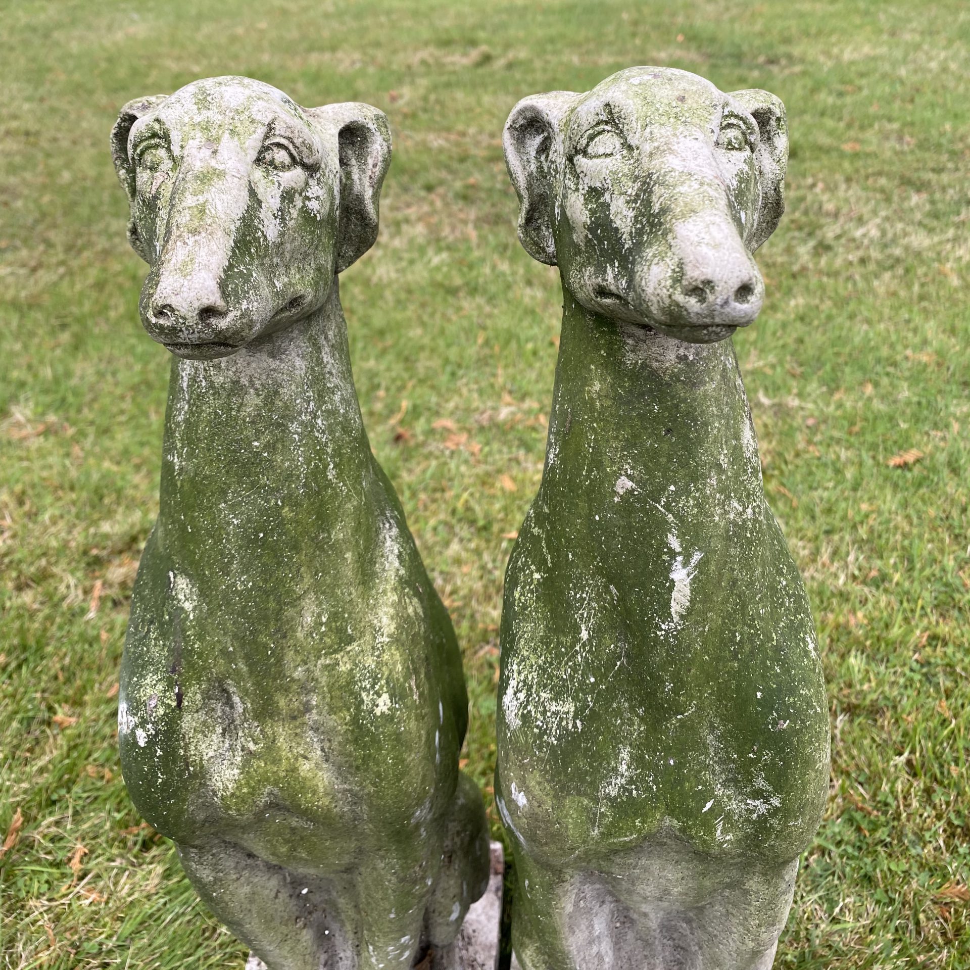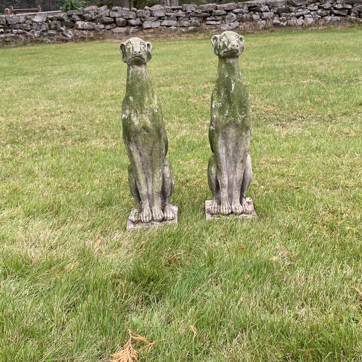 Extremely well weathered pair of dogs…modelled on Italian Greyhounds or Whippets? Either side of a door or steps in the garden. Although smallish they have a regal air about them. Composite stone