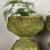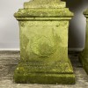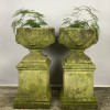Lovely pair of decorative urns and matching plinths in composite stone. Well weathered and well made. Hard to find matching reclaimed pairs with minimal damage. Lovely swag decoration on the urns and wreath decoration on the plinths.